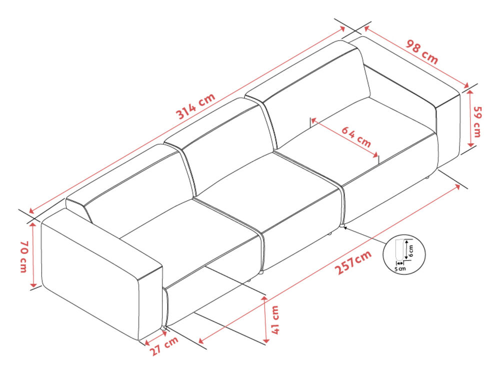 Sohva toimitetaan valmiiksi kasattuina moduuleina, jalat irrallaan. Moduulit kiinnitetään toisiinsa rungossa olevien kiinnikkeiden avulla.