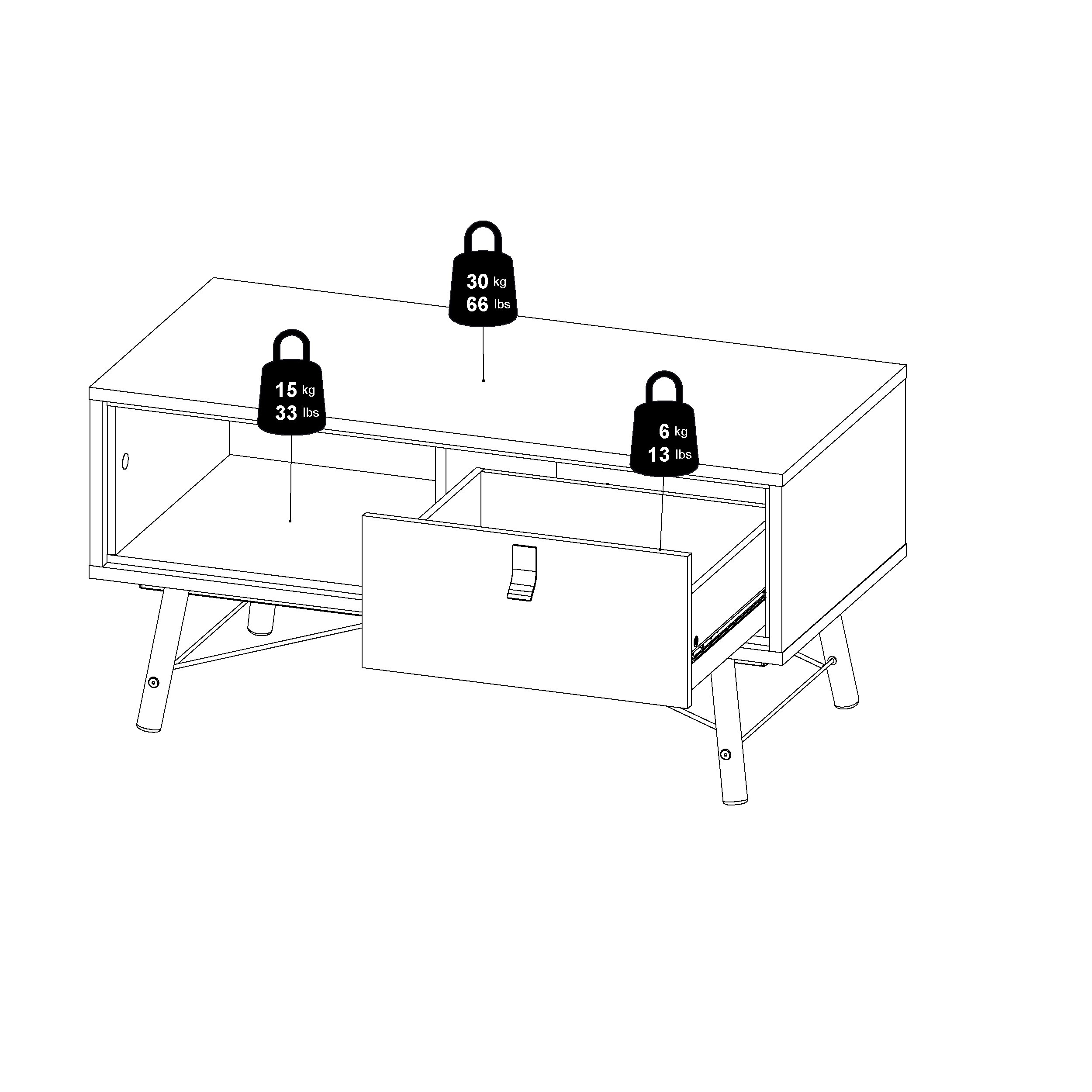 Käytännöllinen vetolaatikko pitää pientavarat siististi poissa näkyviltä ja avohyllylle voit asetella vaikkapa lempikirjat tai sisustusesineet. Sohvapöydän kokonaiskantavuus on 30 kg, vetolaatikon 6 kg ja avohyllyn 15 kg. Ry on kestävä valinta arjen tarpeisiin.