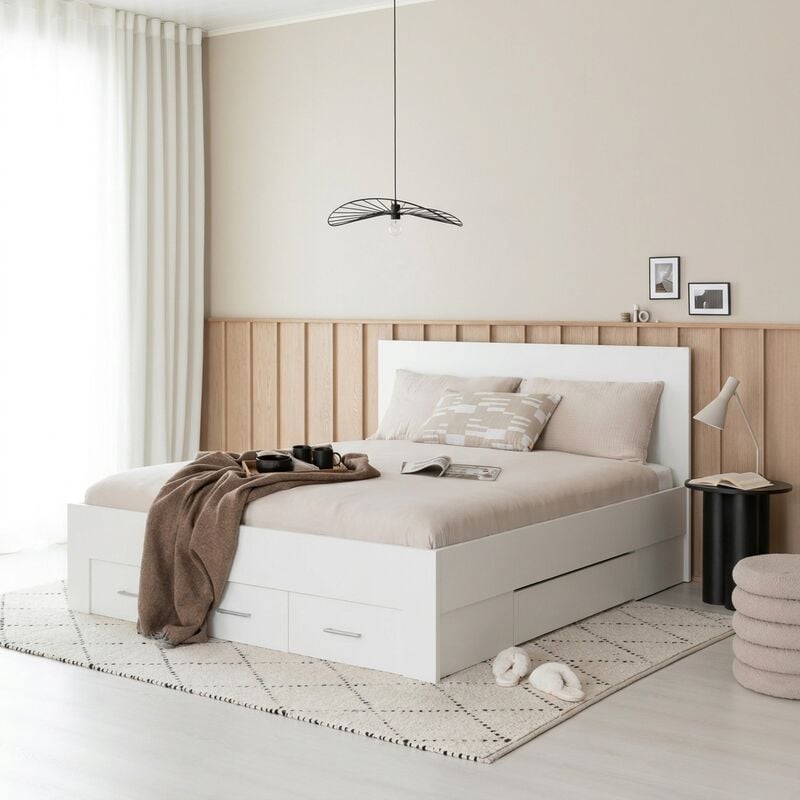 Serafina sängynrunko tuo makuuhuoneeseen selkeyttä ja käytännöllisyyttä. Tilavat säilytyslaatikot pitävät arjen tavarat järjestyksessä. Mukana sälepohja, sopii 180x200 cm patjalle.