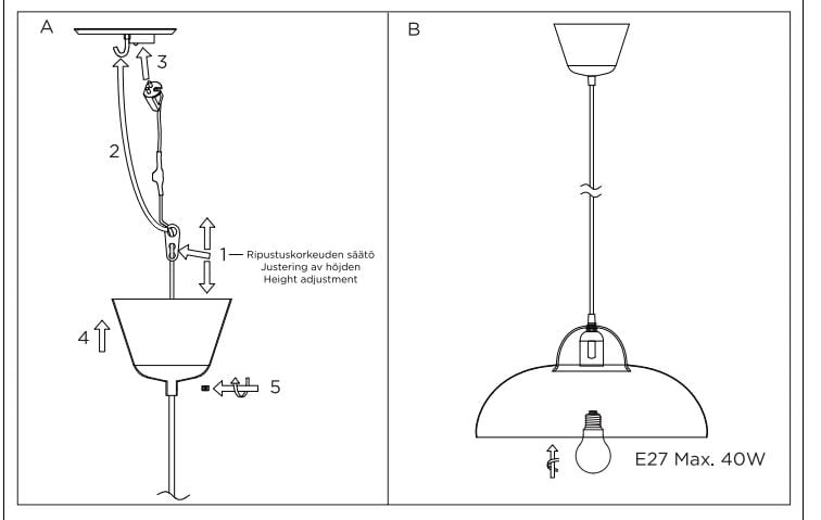 Valaisimessa on tavanomainen skandinaavinen kattokuppi, eli se sopii mainiosti kattokoukkukiinnitykseen ja asennettavaksi helposti valaisinpistorasiaan mukana olevan valaisinpistotulpan kanssa. Valaisimeen käy E27-kantainen lamppu, jonka voit valita Veken monipuolisesta valikoimasta erikseen.