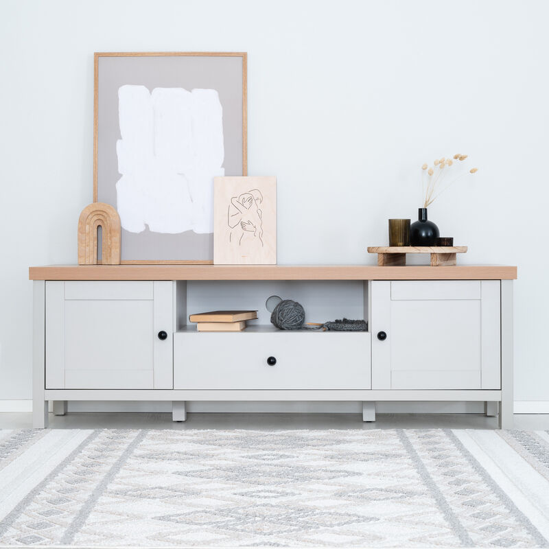 Sevilla TV-taso yhdistää klassisen tyylin ja käytännöllisyyden. Kaksi kaappia, avohylly ja laatikko tarjoavat tilaa viihdelaitteille ja arjen esineille. Avohyllyssä johdonläpivienti, jonka halkaisija 6 cm.