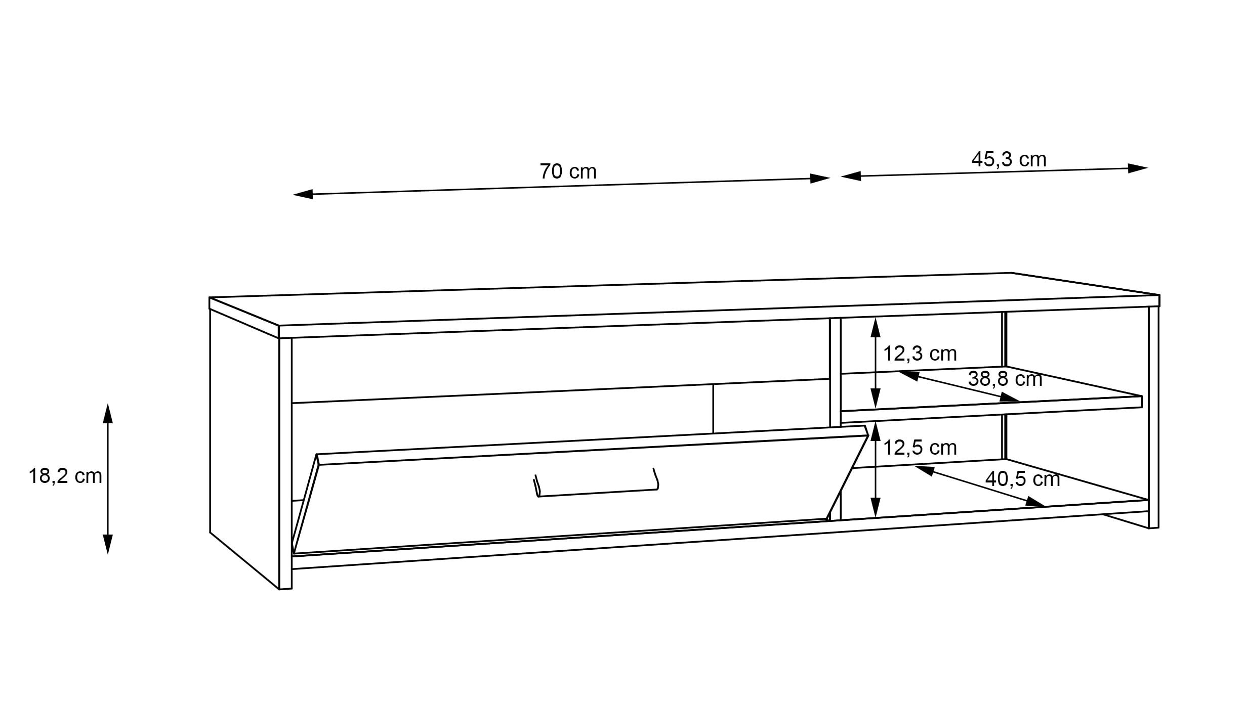 Tv-tasossa on kaapin ovi, jonka takaa löytyy hyvin tilaa esimerkiksi pelikonsolille tai muulle elektroniikalle. Avohyllyt sopivat mainiosti laitteille tai vaikka kirjoille ja sisustusesineille. Kaappi aukeaa kätevällä alaspäin kääntyvällä mekanismilla.