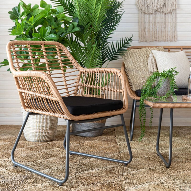 Sirokokoinen Stockton nojatuoliKaunis sirokoinen Stockton nojatuoli irrotettavalla polyester-pehmusteella. Materiaali on UV-suojattua polyrottinkia, tukeva runko mustaksi maalattua metallia. Sirot metallijalat yhdistettynä kepeään istuinosaan tekevät tuolista ilmavan ja kevyen. Sijoita esimerkiksi ruokapöydän ympärille tai pienen sivupöydän pariksi niin parvekkeelle, terassille kuin patiollekin.