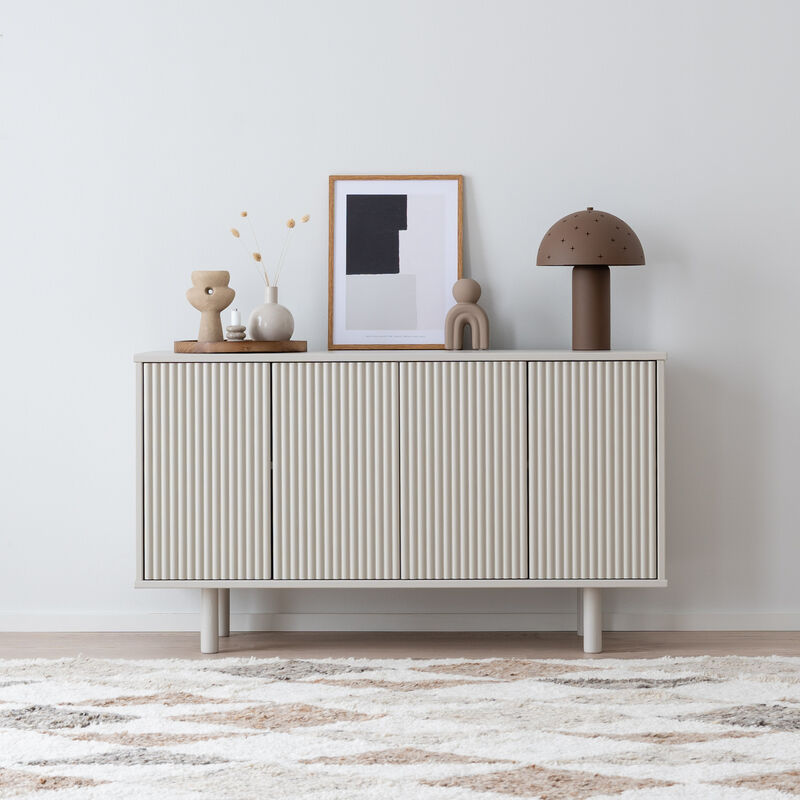 Taika senkin näkyvät osat kuten kannet, sivut ja ovet valmistetaan täysin oksattomasta männystä. Linjakas ja ajaton design sopii monenlaisiin sisustustyyleihin ja luo olohuoneeseen rauhallisen tunnelman. Ovet avautuvat kevyesti ponnahdussaranoiden avulla ja niiden takaa löytyy mukavasti säilytystilaa. Jokaisen oviparin takana on yksi korkeussäädettävä hylly.