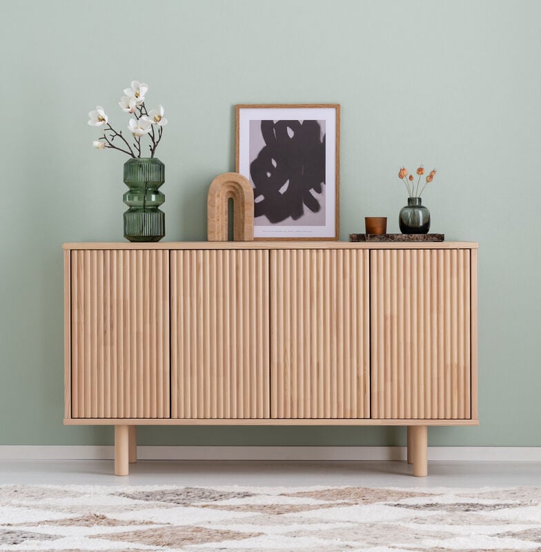 Taika senkin näkyvät osat kuten kannet, sivut ja ovet valmistetaan täysin oksattomasta männystä. Linjakas ja ajaton design sopii monenlaisiin sisustustyyleihin ja luo olohuoneeseen rauhallisen tunnelman. Ovet avautuvat kevyesti ponnahdussaranoiden avulla ja niiden takaa löytyy mukavasti säilytystilaa. Jokaisen oviparin takana on yksi korkeussäädettävä hylly.
