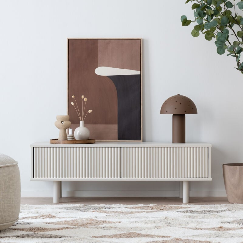 Linjakas ja ajaton design sopii monenlaisiin sisustustyyleihin ja luo olohuoneeseen rauhallisen tunnelman. Käytännölliset kippiovet avautuvat kevyesti ponnahdussaranoilla ja niiden takaa löytyy mukavasti säilytystilaa sekä kätevät läpiviennit johdoille. Bluetooth-laitteet toimivat ovien läpi, mutta infrapunakaukosäätimille ne eivät sovellu.