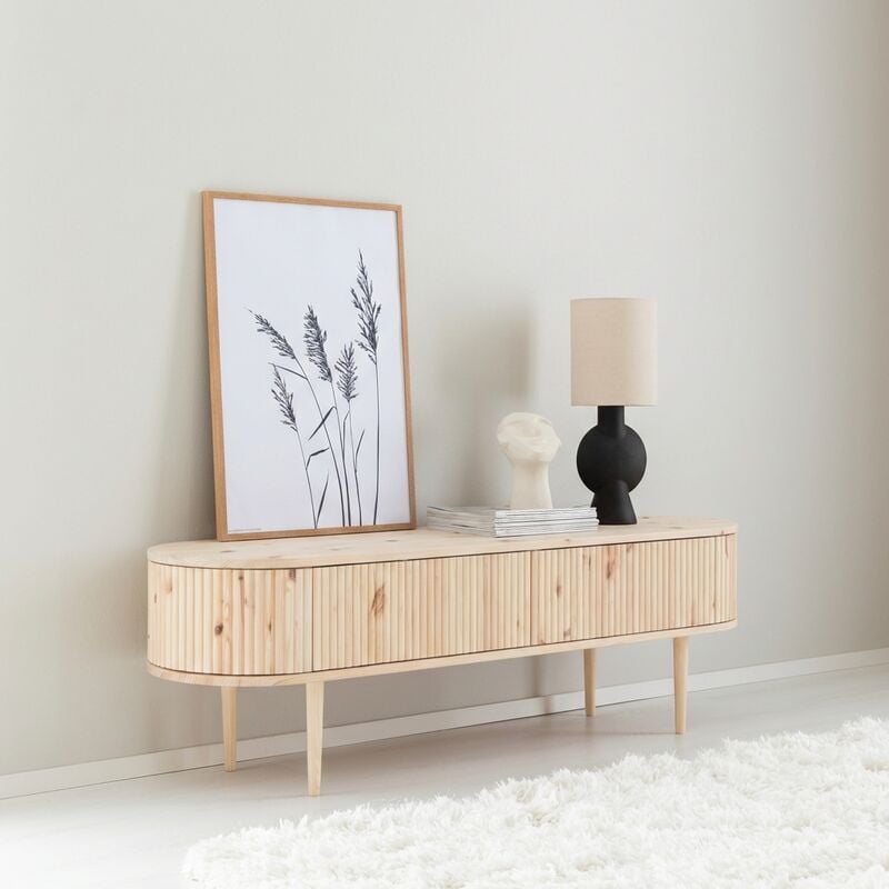 Tv-tason ajaton, skandinaavinen muoto tekee siitä luontevan valinnan monenlaisiin sisustuksiin. Etusarjassa on kaksi kippiovea helppokäyttöisillä ponnahdussaranoilla. Ovien läpi toimivat Bluetooth-laitteet, mutta infrapunakaukosäätimet eivät kulje puun läpi. Tason vahva massiiviliimapuutausta mahdollistaa seinäkiinnityksen myös ilman jalkoja, ja taustalevyssä on valmiit reiät asennusta varten. Kiinnitykseen tarvitset seinämateriaalillesi sopivat ruuvit ja kiinnikkeet, jotka eivät sisälly toimitukseen. Jaloissa on kätevä M8-kierrekiinnitys.