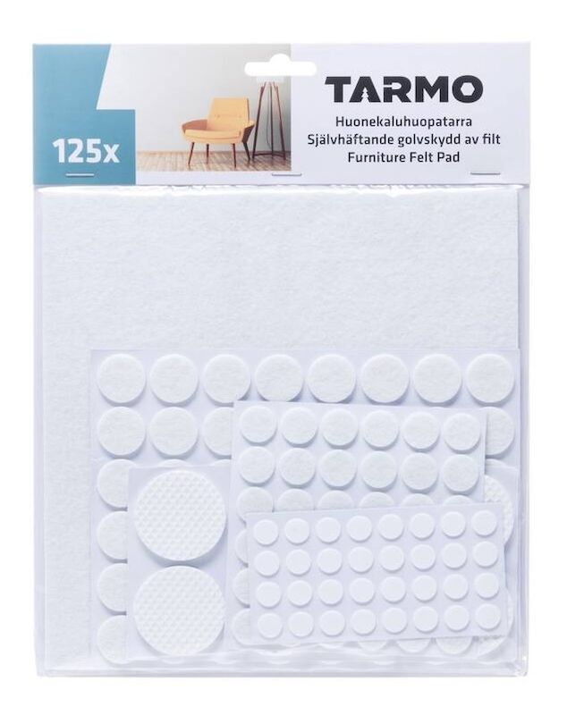 Pehmeä, suojaava, ääntä vaimentava Tarmo huopatarra, 125 kpl pakkauksessa.