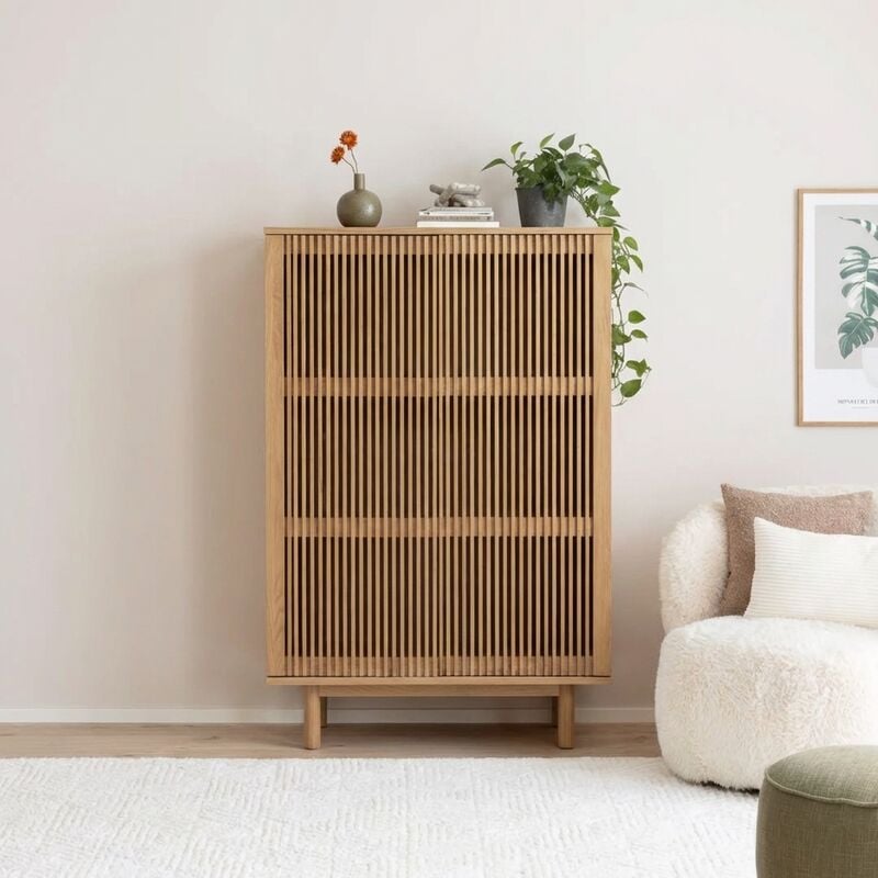 Tiber kaappi 95x140cm aidolla tammella ja ilmavalla säleovella. Lakattu pinta suojaa ja korostaa puun sävyä. Tilava ja selkeä kaappi tuo lämpöä sekä käytännöllistä säilytystilaa olohuoneeseen, ruokailutilaan tai makuuhuoneeseen.
