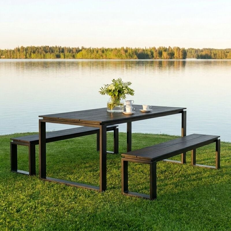 Pöydän reilu koko 210 x 100 cm tarjoaa hyvin laskutilaa kattauksille ja tarjoiluille. 180 cm pitkät penkit mahtuvat pöydän ääreen kevyesti ja tekevät istumisesta joustavaa, kun paikkoja tarvitaan nopeasti lisää.