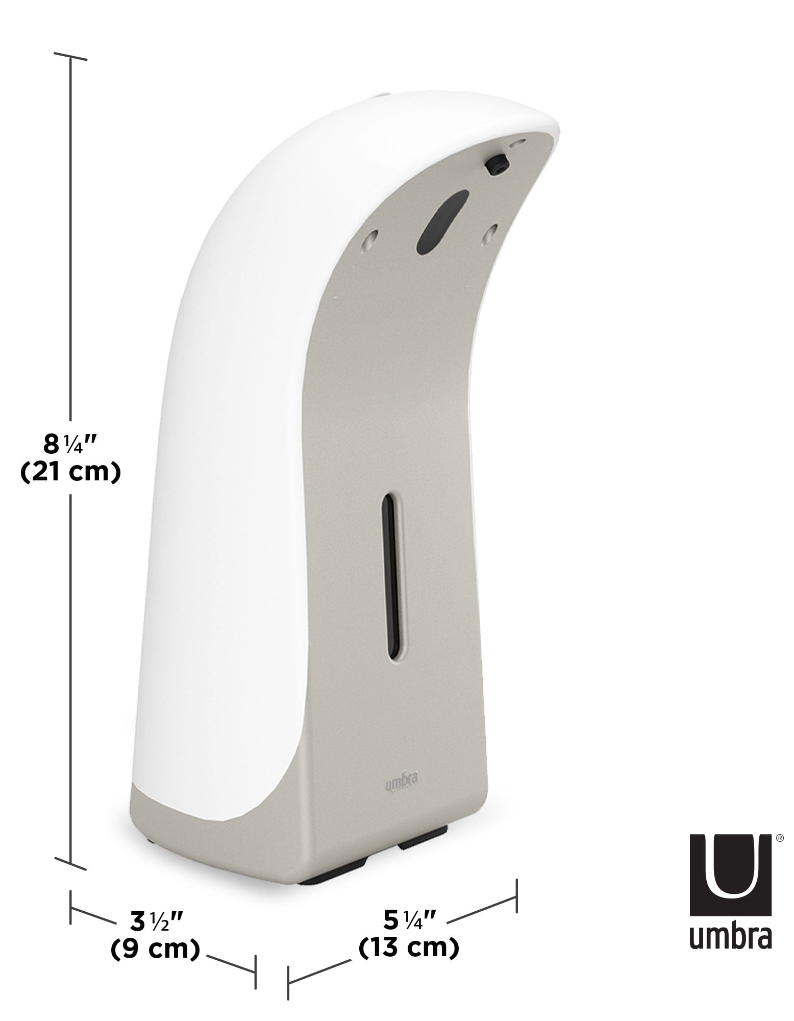 Tyylikäs Umbra Emperor saippua-automaattiUmbra Emperor saippua-automaatti tuo hygieenisyyttä kotisi kylpyhuoneeseen ja keittiöön. Tyylikäs kurvikas muotoilu sopii mihin tahansa kotiin. Helppokäyttöinen saippua-automaatti sopii käytettäväksi nestemäisen tiski- tai käsisaippuan sekä käsidesin kanssa. Emperor annostelee joka kerta sopivan määrän kosketusvapaasti. Täyttäminen on helppoa ja säiliöön mahtuu 355 ml nestettä. Emperorissa on kaksi LED-merkkivaloa, jotka näyttävät virran kytkemisen ja sammutuksen, käytössä olon ja heikon virran. Saippuapumppu toimii neljällä AAA-paristolla, jotka eivät sisälly toimitukseen.