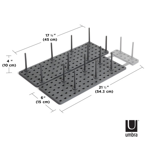 Säädettävä Umbra Peggy laatikon järjestäjäKevyt, säädettävä ja käytännöllinen Umbra Peggy laatikon järjestäjä. Peggy järjestää säilytysrasiat, kattilat, kulhot ja ruoanlaittovälineet keittiössäsi. Laatikon järjestäjästä löytyy 108 reikää ja 16 vapaasti siirreltävää tappia, joiden avulla voit muokata tarpeisiisi sopivan säilytysratkaisun. Luistamaton pohja ja säädettävä pituus varmistavat, että tavarat pysyvät paikoillaan.