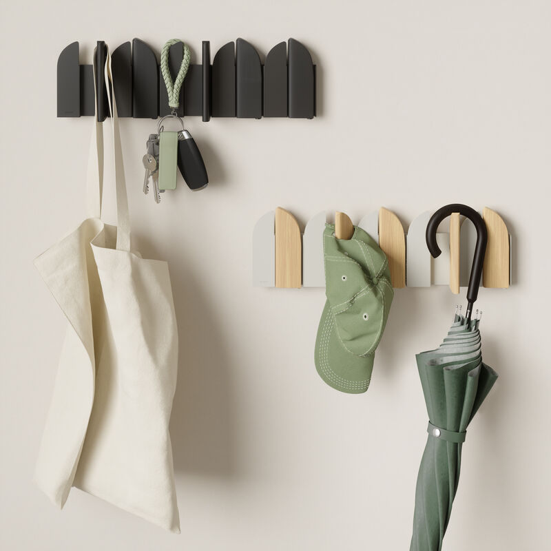 Umbra Saloon naulakko yhdistää leikkisän muotoilun ja arjen käytännöllisyyden. Viisi käännettävää koukkua tarjoavat paikan takeille, laukuille ja asusteille.
