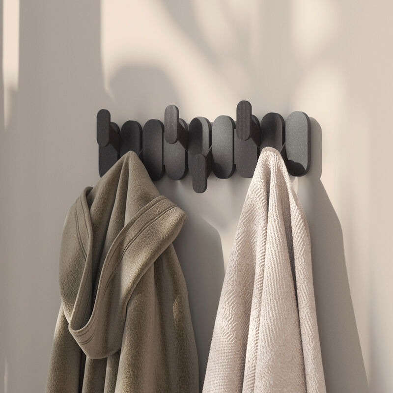 Umbra Tempo 6 -naulakko yhdistää modernin ilmeen ja arjen toimivuuden. Kuusi porrastettua koukkua maksimoivat ripustustilan ja tekevät seinälle selkeän, graafisen rytmin. Takkien, laukkujen ja pyyhkeiden järjestely sujuu helposti, ja jokaiselle löytyy oma paikkansa.