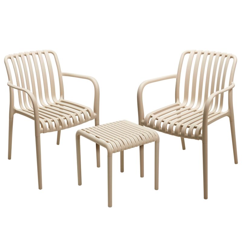 Verde parvekesetti tuo selkeää tyyliä ja helppoutta parvekkeelle tai terassille. Settiin kuuluu kaksi nojatuolia ja yhteensopiva pöytä. Kevyt mutta kestävä polypropeeni sopii ulkokäyttöön ja on vaivaton pitää puhtaana.