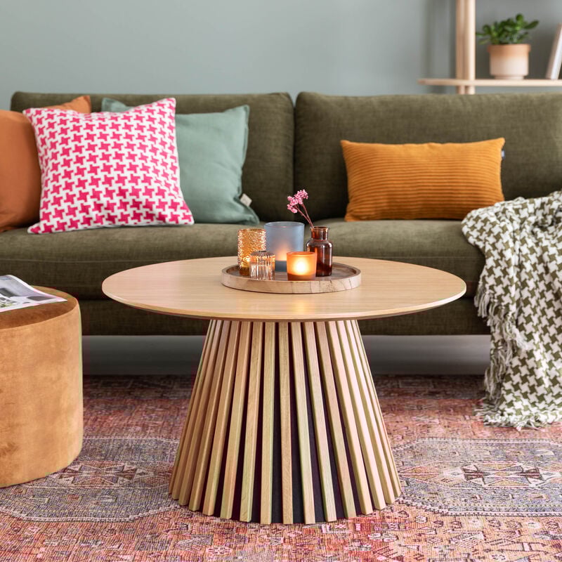 Villa pyöreä sohvapöytä on kuin taideteos keskellä olohuonetta. Sen pyöreä pöytätaso on tammiviilutettua mdf-levyä. Jalkaosan rimat ovat aitoa tammea. Lakatun pintansa ansiosta pöytä on helppohoitoinen. Pöydässä tulee upeasti esille puun kauneus ja ainutlaatuisuus. Tämä sohvapöytä sopii monenlaiseen sisustukseen, tuoden ripauksen skandinaavista minimalismia kotisi sydämeen.