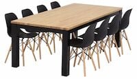 Moderni ja selkeälinjainen Vuono-Rana ruokailuryhmä 8-hengelle. Suuren pöydän ääreen mahtuu isompikin ryhmä viettämään iltaa. Pöytä on tukevarakenteinen ja tuolit ovat helppohoitoiset sekä käytännölliset, muovisen istuinosan ansiosta. Tyylikäs, mustan ja luonnonvärisen puun väriyhdistelmä toimii hyvin, se sopii erityisesti skandinaaviseen sisustukseen. Pöydän kansi on koivua ja mustat kantikkaat jalat MDF:ää. Tuolin jalat käsittelemätöntä, luonnonväristä pyökkiä. Istuinosa on laadukasta ja joustavaa ABS-muovia.