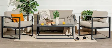 Kalusteiden kestävä teräsrunko on käsitelty kolmen vaiheen prosessilla, joka takaa pitkän käyttöiän ja kestävyyden vaihtelevissa sääolosuhteissa. UV-suojatut pehmusteet säilyttävät värinsä auringossa ja irrotettavat päälliset tekevät puhdistamisesta helppoa.