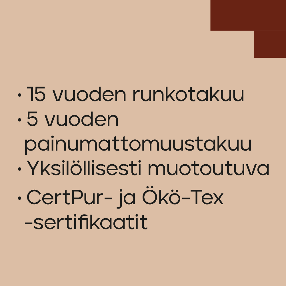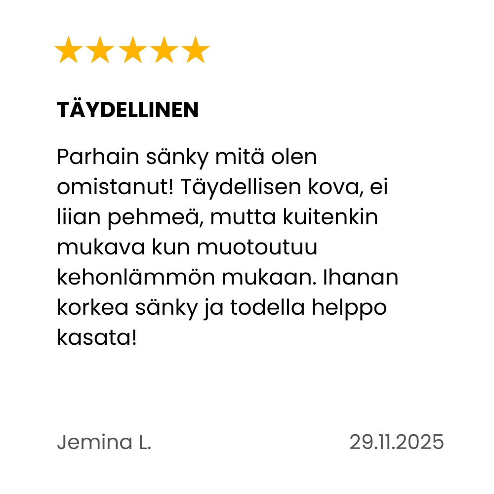 Unia Ergo on Suomessa valmistettu kotimainen sänkysarja, joka tarjoaa keholle tukea ilman perinteisiä jousia. Sen ytimessä on viskoelastinen erikoisvaahto, joka muokautuu lämmön ja painon vaikutuksesta nukkujan muotoihin, tasaa painetta ja vähentää puutumisen riskiä. Sarjasta on saatavilla jenkkisänkyjä, moottorisänkyjä ja runkopatjamalleina eri levyyksillä. Sänky on verhoiltu kestävällä ja tyylikkäällä huonekalukankaalla. Kokonaisuuden viimeistelee 18 cm korkeat tammenväriset koivujalat. Osta lisäksi samalla kankaalla verhoiltu Unia Ergo sängynpääty ja luo näyttävä kokonaisuus!