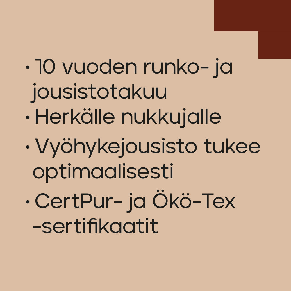 Suosittelemme Unia Kulta -malliston sänkyjä nukkujille, jotka arvostavat tukea ja mukavuutta samassa paketissa. Sarja sopii erityisesti kylkinukkujille, jotka haluavat hyvän tuen eri kehon osille — vyöhykejousitus tarjoaa joustavuutta hartioille ja riittävää tukea lantiolle. Niille, jotka kaipaavat vieläkin säätömahdollisuutta, Unia Kulta tarjoaa moottorimallin, jossa sekä pää- että jalkopää säätyvät hiljaisella moottorilla.