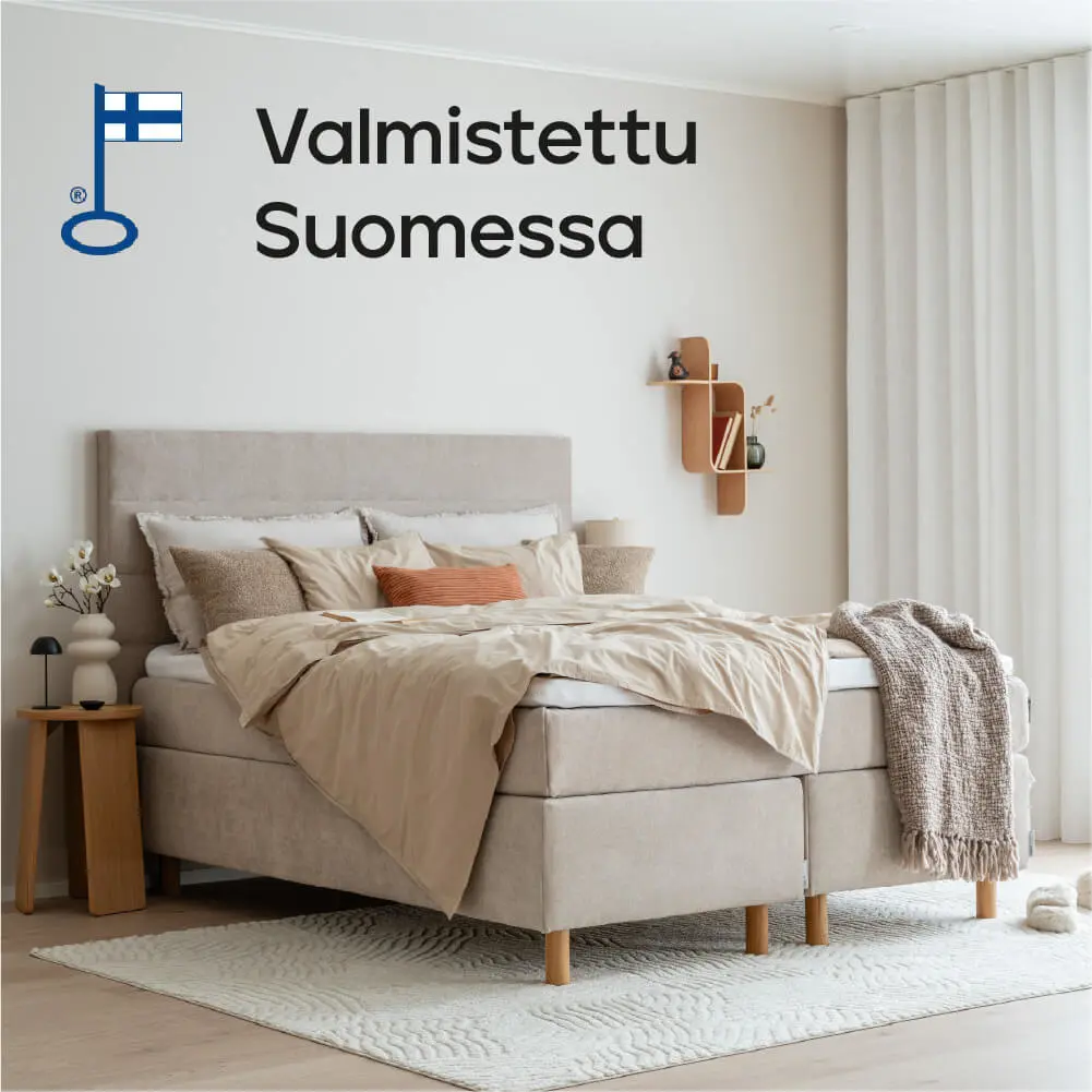Unia Kulta-sarjan sängyt valmistetaan Suomessa. Sekä jousistolle että rungolle annetaan 10 vuoden takuu. Verhoilukankaana on tyylikäs ja helppohoitoinen Easy Clean-huonekalukangas, joka hylkii likaa. Pienet tahrat lähtevät pelkällä vedellä tai miedolla saippualiuoksella. Kangas on myös OEKO-TEX® STANDARD 100 -sertifioitu, mikä tarkoittaa, että se on testattu haitallisten aineiden varalta ja turvallinen käyttää kodin sisustuksessa.